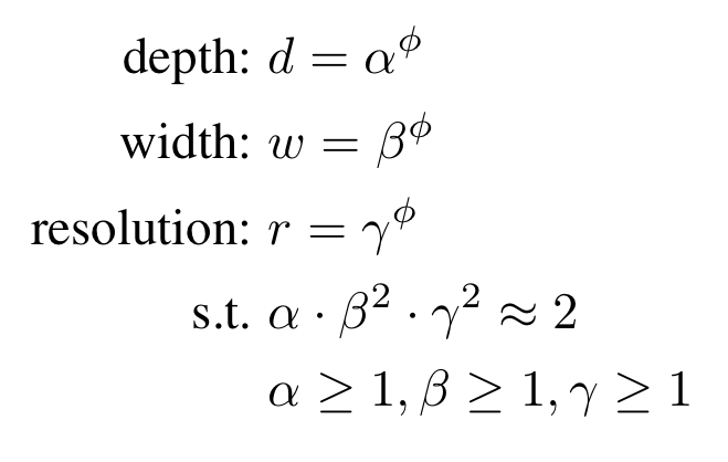 Intuitively, φ is a user-specified coefficient that controls how many more resources are available for model scaling, while α, β, γ specify how to assign these extra resources to network width, depth, and resolution respectively. (…) In this paper, we constraint such that for any new , the total FLOPS will approximately increase by .