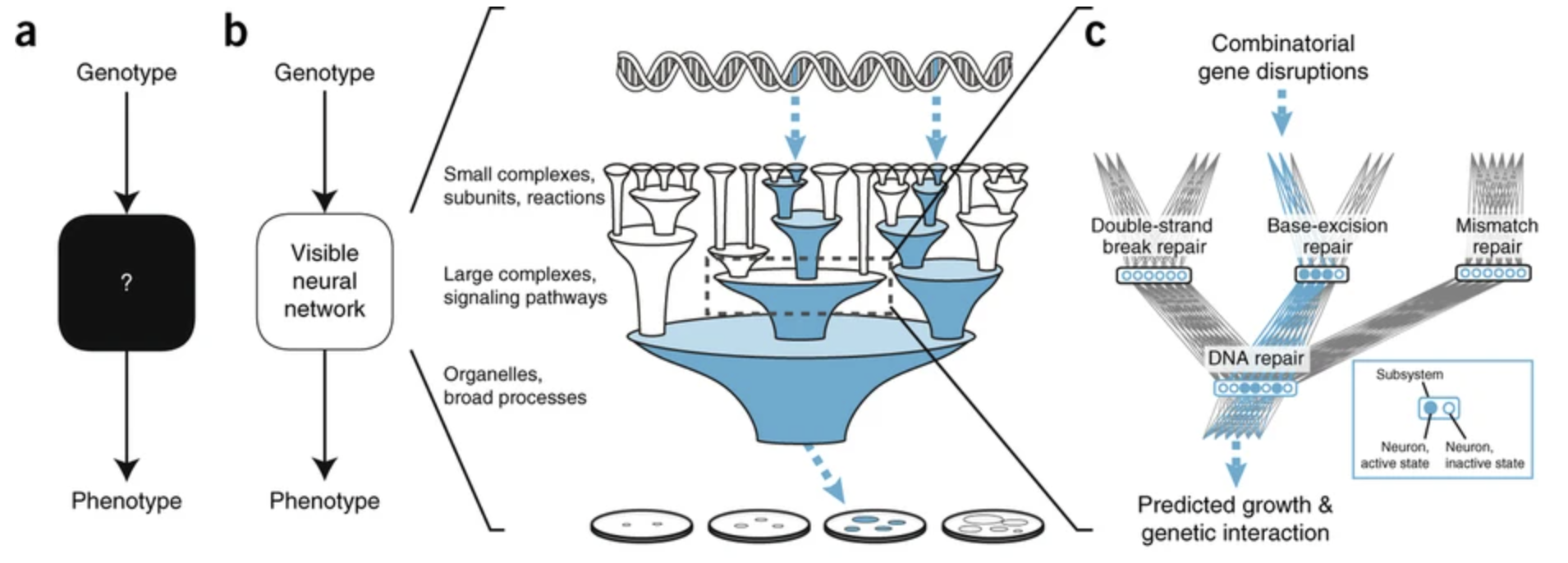 DCell trains a deep neural network to predict phenotype from genotype, with architecture that exactly mirrors the hierarchical structure of an ontology of cellular subsystems. Each cellular subsystem is represented by a group of hidden variables (neurons) in the neural network, and each parent–child relation is represented by a set of edges that fully connect these groups of hidden variables.
