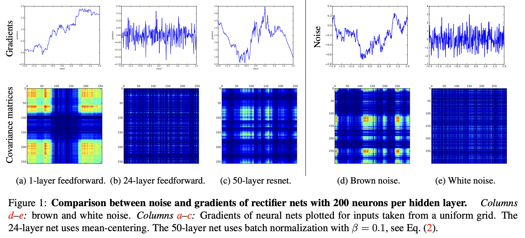 TLDR; In neural networks, the correlation between the gradients decreases exponentially as the number of layers increases, which makes training difficult. Residual connections slow down this “obliteration of spacial structure.”