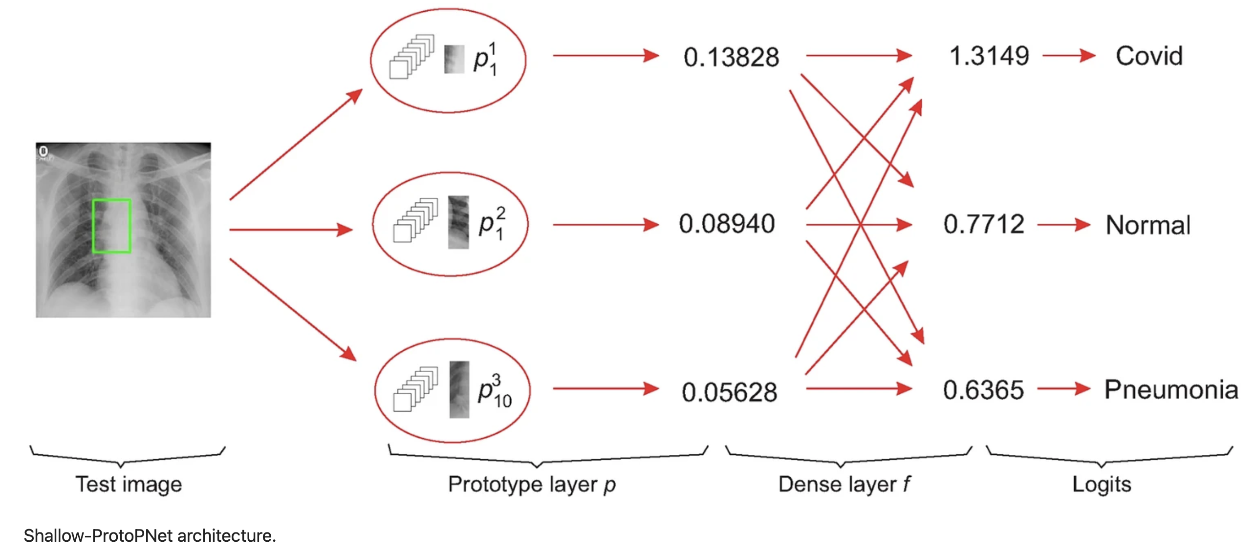 To classify an input image, the model finds the Euclidean distance between each latent patch of the input image and the learned prototypes of images from different classes. The maximum of the inverted distances between a prototype and the patches of the input image is called the similarity score of the prototype. Note that the smaller the distance, the larger the reciprocal, and there will be only one similarity score for each prototype. Then the vector of similarity scores is multiplied with the weight matrix associated with the dense layer f to obtain logitis, which are normalized using Softmax to determine the class of the input image.
